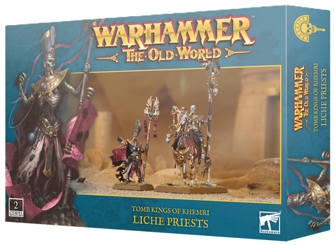 Holding the secrets of unlife, Liche Priests are the root of the Tomb King’s power, conducting powerful rituals to recall spirits from the Realm of Souls and wielding ancient Nehekharan lore to smite their foes in battle. This new box contains two plastic Liche Priests, one on foot and one mounted on a barded skeletal steed. Each has a number of interchangeable options, including four heads, a pair of scales that can be swapped across both models, and a choice of staff toppers. The priest on foot also has options for a magical effect base topper and an eerie floating scroll.